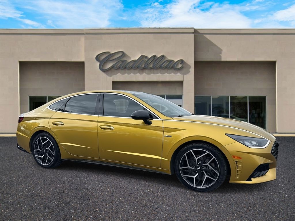 Plaza Cadillac is very proud to offer this attractive 2021 Hyundai Sonata N Line in Glowing Yellow Beautifully equipped with Summer Tires (Option Group 06), Black Leather, 12 Speakers, 4-Wheel Disc Brakes, ABS brakes, Air Conditioning, Alloy wheels, AM/FM radio: SiriusXM, Apple CarPlay & Android Auto, Auto High-beam Headlights, Auto-dimming Rear-View mirror, Automatic temperature control, Bose Premium Audio, Brake assist, Bumpers: body-color, Cargo Net, Carpeted Floor Mats, Delay-off headlights, Driver door bin, Driver vanity mirror, Dual front impact airbags, Dual front side impact airbags, Electronic Stability Control, Emergency communication system: Blue Link Connected Car Service (3-year complimentary subscription), Exterior Parking Camera Rear, First Aid Kit, Four wheel independent suspension, Front anti-roll bar, Front Bucket Seats, Front Center Armrest, Front dual zone A/C, Front reading lights, Fully automatic headlights, Garage door transmitter: HomeLink, Heated door mirrors, Heated front seats, Heated N Unique Sport Seats, Illuminated entry, Knee airbag, Low tire pressure warning, Nappa Leather/Dinamica Seating Surfaces, Navigation System, Occupant sensing airbag, Outside temperature display, Overhead airbag, Overhead console, Panic alarm, Passenger door bin, Passenger vanity mirror, Power door mirrors, Power driver seat, Power moonroof, Power steering, Power windows, Radio data system, Radio: AM/FM/MP3/HD/SiriusXM Display Audio w/Nav, Rear anti-roll bar, Rear seat center armrest, Rear side impact airbag, Rear window defroster, Remote keyless entry, Reversible Cargo Tray, Security system, Speed control, Speed-sensing steering, Speed-Sensitive Wipers, Split folding rear seat, Spoiler, Steering wheel mounted audio controls, Tachometer, Telescoping steering wheel, Tilt steering wheel, Traction control, Trip computer, Turn signal indicator mirrors, Variably intermittent wipers, Wheel Locks, Wheels: N Unique 19" Alloy, and Wireless Device Charging! Awards: