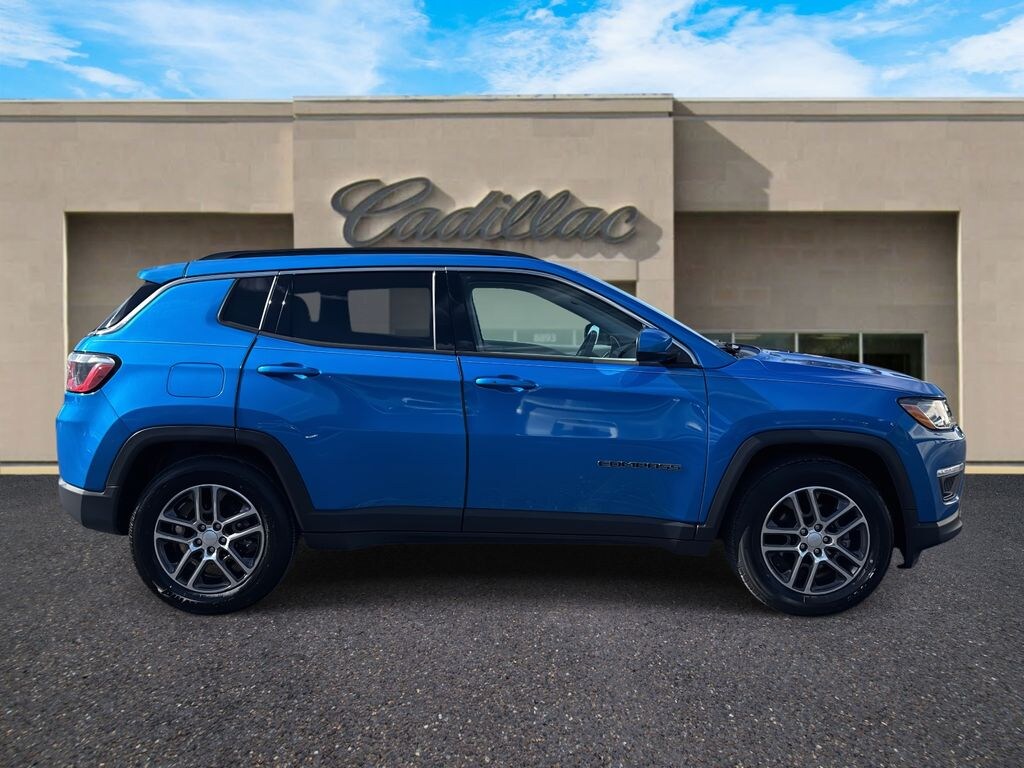 Plaza Cadillac is delighted to offer this great-looking 2019 Jeep Compass Latitude in Laser Blue Beautifully equipped with Popular Equipment Group (4-Way Power Lumbar Adjust, Cluster 7.0" Color Driver Info Display, and Power 8-Way Driver/Manual 6-Way Passenger Seats), Quick Order Package 28K Sun & Wheel (Power Front/Fixed Rear Full Sunroof, Sun & Wheel Group, and Wheels: 17" x 7.0" Polished/Granite Pockets Alum), 3.502 Axle Ratio, 4-Wheel Disc Brakes, 6 Speakers, ABS brakes, Air Conditioning, Alloy wheels, AM/FM radio, Anti-whiplash front head restraints, Auto-Dimming Rear-View Mirror, Automatic temperature control, Bluetooth® Streaming Audio, Brake assist, Bumpers: body-color, Compass, Delay-off headlights, Driver door bin, Driver vanity mirror, Dual front impact airbags, Dual front side impact airbags, Electronic Stability Control, Four wheel independent suspension, Front anti-roll bar, Front Bucket Seats, Front Center Armrest w/Storage, Front dual zone A/C, Front fog lights, Front reading lights, Fully automatic headlights, Heated door mirrors, Illuminated entry, Knee airbag, Leather Shift Knob, Low tire pressure warning, Media Hub (USB, AUX), Occupant sensing airbag, Outside temperature display, Overhead airbag, Overhead console, Panic alarm, ParkView Rear Back-Up Camera, Passenger door bin, Passenger vanity mirror, Power door mirrors, Power steering, Power windows, Premium Cloth/Vinyl Bucket Seats, Radio: Uconnect 4 w/7" Display, Rear anti-roll bar, Rear seat center armrest, Rear window defroster, Rear window wiper, Remote keyless entry, Remote Start System, Roof rack: rails only, Speed control, Split folding rear seat, Spoiler, Steering wheel mounted audio controls, Tachometer, Telescoping steering wheel, Tilt steering wheel, Traction control, Trip computer, Variably intermittent wipers, and Wheels: 17" x 7.0" Silver Painted Aluminum!